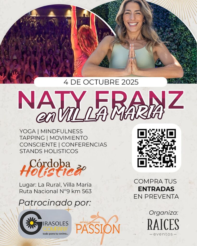 El próximo 4 de octubre de 2025, Villa María se transformará en el epicentro del yoga, la conciencia plena y las prácticas holísticas, de la mano de Naty Franz y un gran equipo de especialistas.